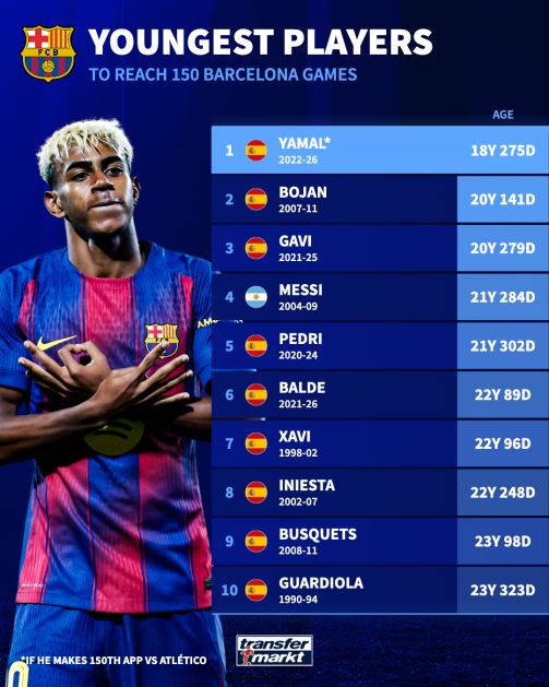 亞馬爾完成150場時只有18歲零275天,是巴薩隊史達到這一里程碑最年輕的球員。他打破了博揚的紀錄——博揚在2011年完成150場時是20歲零141天,比亞馬爾大了將近兩歲。