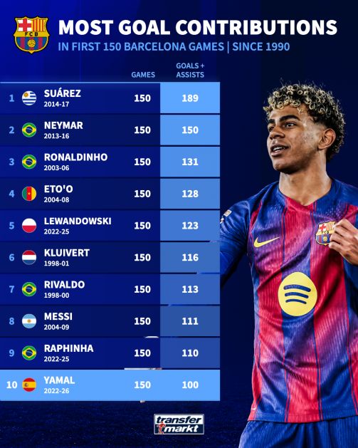 薩前150場比賽進球參與最多的球員中,亞馬爾也進入了前十。排第一的是烏拉圭前鋒蘇亞雷斯,他在前150場中貢獻了驚人的189次進球參與。