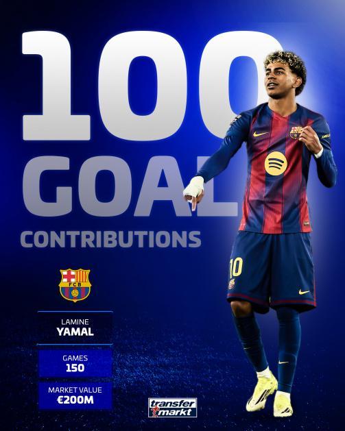 雖然沒有晉級,但對于18歲的天才亞馬爾來說,這依然是一個特殊的夜晚。他完成了自己在巴薩的第150次出場,同時也達成了個人在俱樂部的第100次進球參與(進球+助攻)。